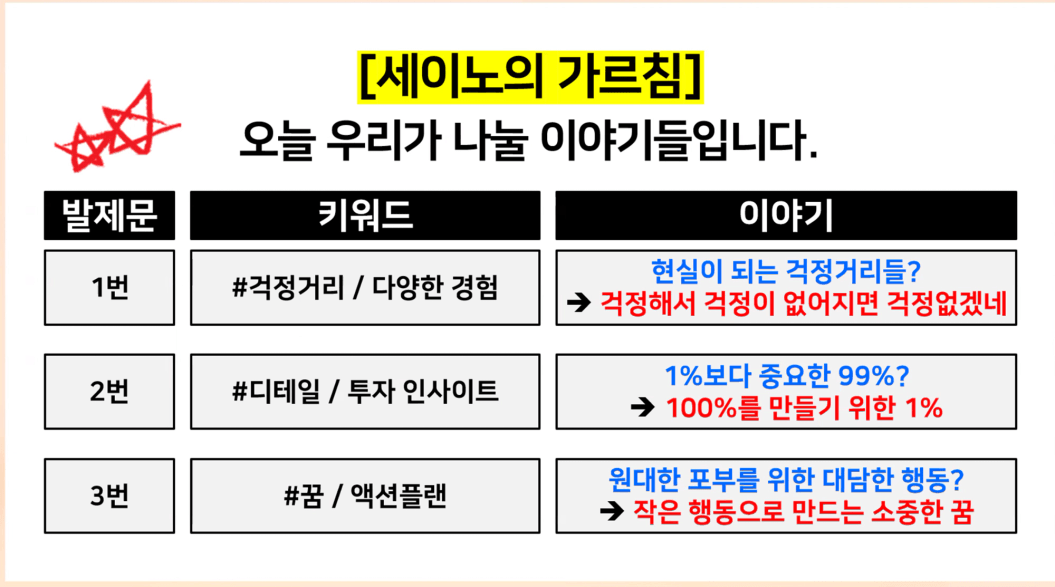 꿈과 실행계획에 대해선 ‘원대한 포부를 위한 대단한 행동’이 아니라, 작은 행동으로 만드는 소중한 꿈이 더 강력하다는 메시지에 모두가 공감했습니다. 특히 각자의 목표를 이뤄나가기 위한 다짐과 습관을 이야기 했습니다.