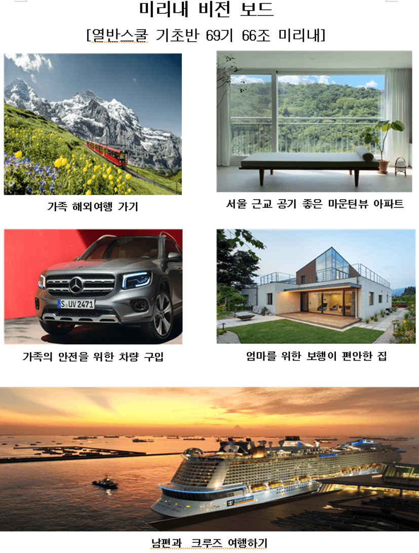- 1채 임대 시스템, 앞마당 5개 확보, 독서 연간 30권, 자녀들 월부 권유