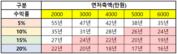 - 수익률 5%: 26+47 = 73세 (2073년)