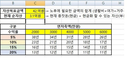 -목표 금액 : 42억 (현재 나이 37세, 연저축 3840 만원)