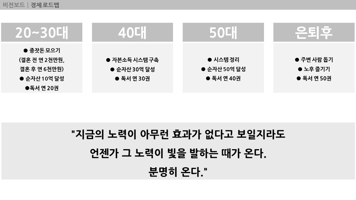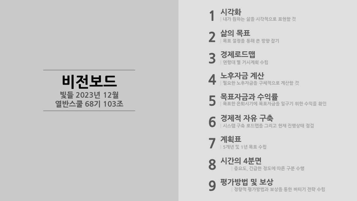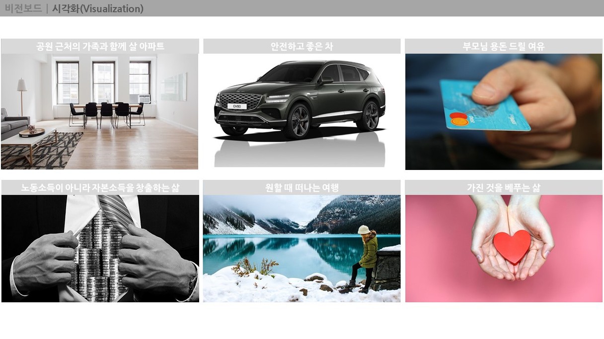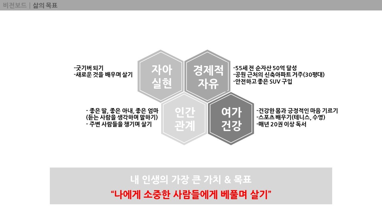 모찌롱님께서 올려주신 양식을 참고하여 비전보드를 작성해보았습니다. 그동안은 막연히 생각했던 내 미래를 구체적으로 그려보는 것은 생각보다 많은 시간이 걸렸습니다. 비전보드를 작성하는 시간동안 앞으로 나아가야 할 방향을 생각해볼 수 있었습니다. 이 비전보드를 하나씩 실천해 나가도록 노력하겠습니다.
