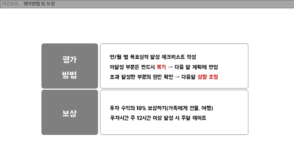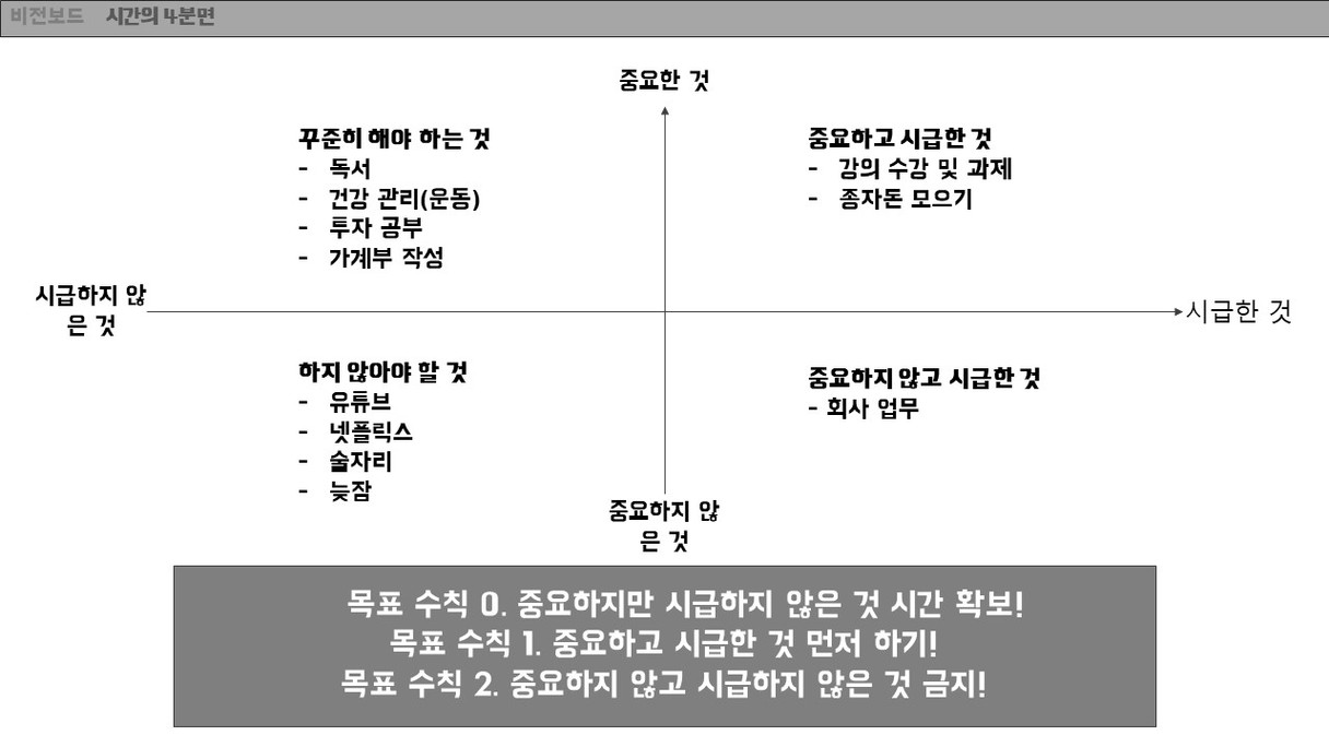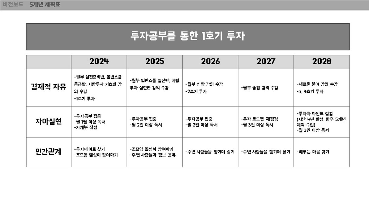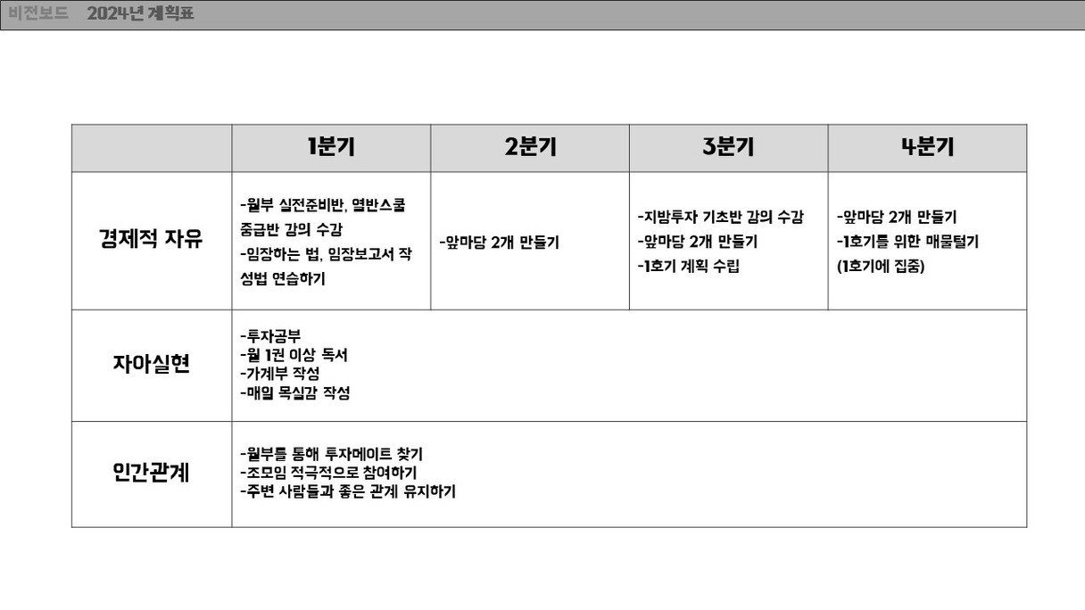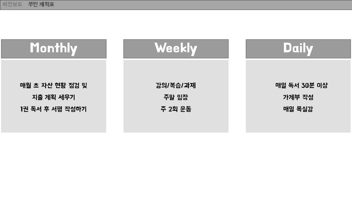 모찌롱님께서 올려주신 양식을 참고하여 비전보드를 작성해보았습니다. 그동안은 막연히 생각했던 내 미래를 구체적으로 그려보는 것은 생각보다 많은 시간이 걸렸습니다. 비전보드를 작성하는 시간동안 앞으로 나아가야 할 방향을 생각해볼 수 있었습니다. 이 비전보드를 하나씩 실천해 나가도록 노력하겠습니다.