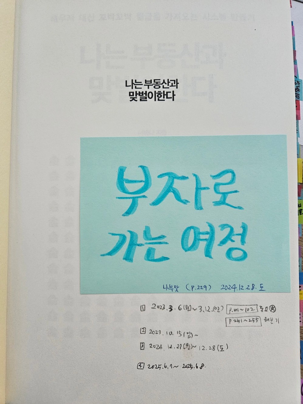 부자로 가는 여정~ <나는 부동산과 맞벌이한다> 2023년, 유튜브를 통해 월부를 알고, 너바나님을 알고, 너바나님이 쓴 책이 있다는 것을 알고 찾아보니 벌써 절판이 되었더라구요. 그 당시는 지금보다 중고서적 구입이 쉬워서 정가보다 조금 더 비싸게(아마 2배 정도?) 이 책을 구입하게 되었습니다. 워킹맘인 저이지만, 저도 부동산과 맞벌이하고 싶어서 이 책을 꼭 읽고 싶었습니다. 너나위님이 말씀하신, 본인을 부동산 투자로 이끈 빨간 책! 월부의 많은 강사님들이 읽었다는 그 책! 그 책을 저도 갖게 되어서 너무 행복했습니다. 2023년부터~ 이번 추천도서 독서까지 총 4번을 읽었습니다. 이 책을 보면, 부자로 가는 여정~ (p229)라는 단어가 저에게 참 와닿는 것 같습니다. 너바나님이 투자하던 10여년 전과는 환경이 조금 달라지긴 했지만, 직장인이 경제적 자유를 이룰 수 있는, 착실하게 노력하면 얻을 수 있는 방법은 역시 부동산 투자라는 점에서, 많은 직장인에게 의미있는 책이라 생각됩니다.