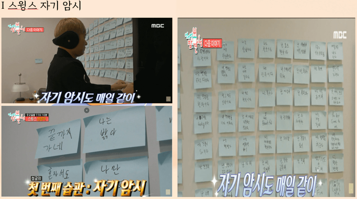 래퍼 스윙스가 포스트잇에 본인의 꿈과 긍정적인 메시지를 작성하여 벽에 붙인 후 매일 자기 암시를 하는