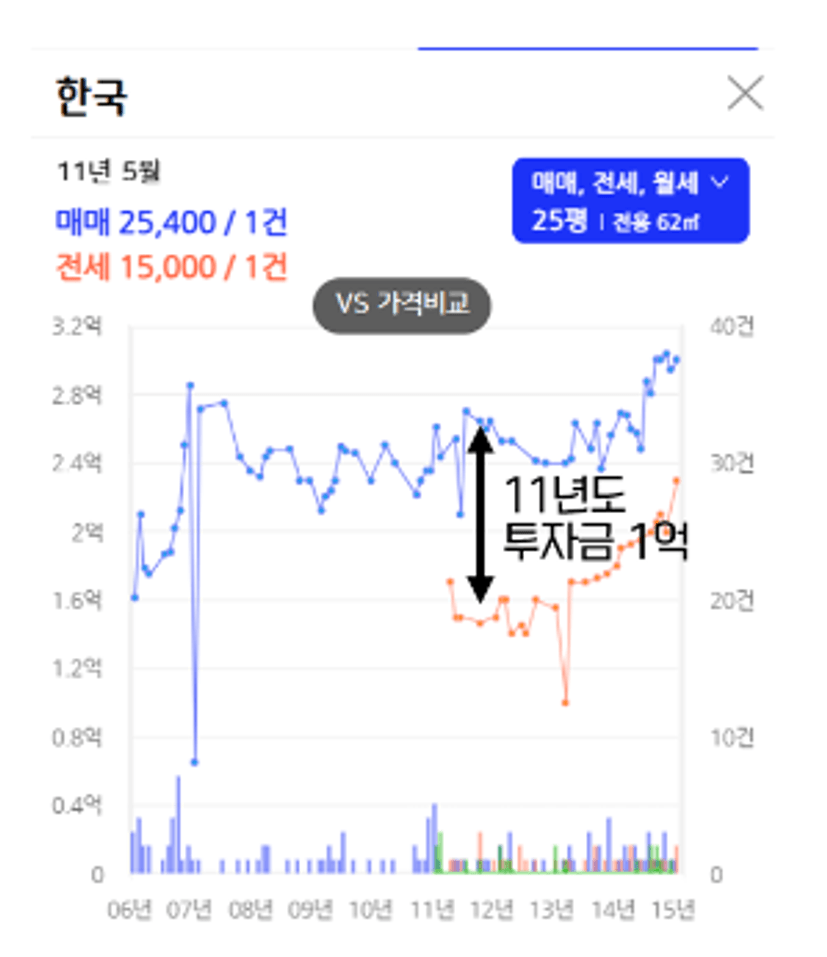 11년 5월은 매매와 전세가격이 1억 가량 차이가 났고