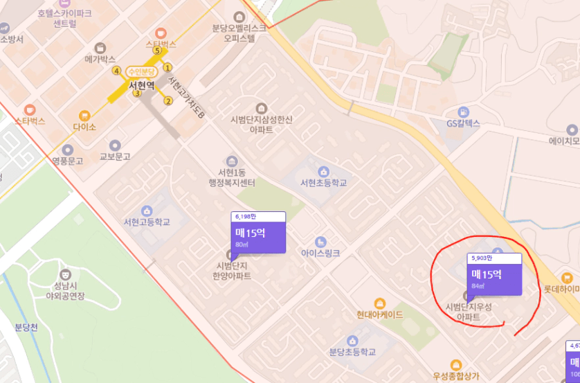 1기 신도시 중 분당(서현역)의 재건축 예정 단지와 서울(옥수역)의 재건축 예정 단지의 매매가가 동일하게 올라왔더라구요. 25평형으로 동일한 규모에 중층으로 층수도 비슷합니다.