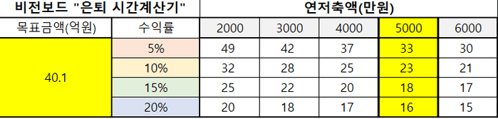 목표 금액 40.1억 (현재 나이 30세, 연 저축액 5,000만원) -> 예비 배우자와 합산하여 산출