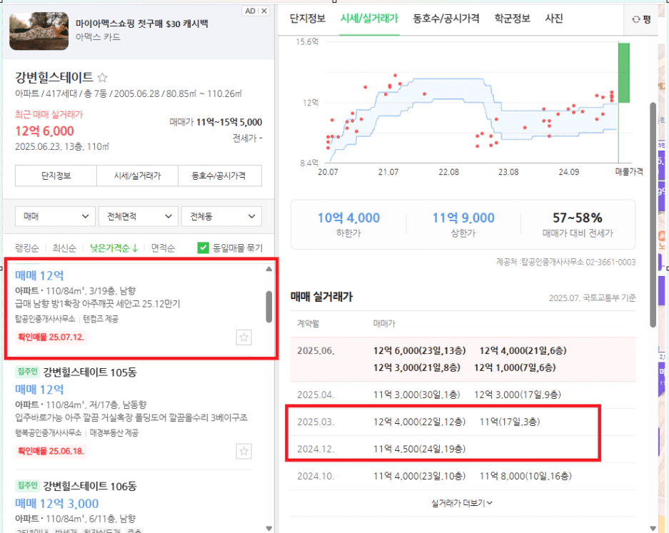 강변힐스테이트: 전고점보다 10% 하락. 최근 들어 실입주 가능한 매물(3층 12억, 11.7억 협의 가능)이 나와서 상대적으로 현실적인 시나리오입니다. 만약 11.7에 된다면 예산과 부합합니다.