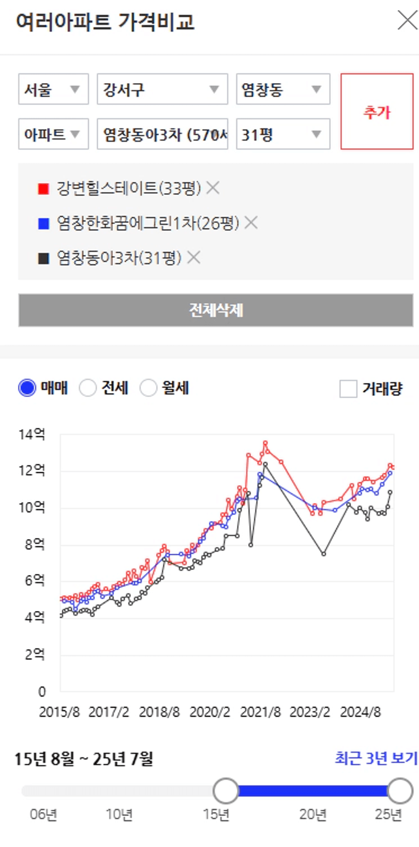 염창동아3차: 전고점 대비 15% 하락한 10억5천 선에서 매수가 가능, 대출 부담이 줄지만, 크게 떨어진 이후 향후 회복성에 대한 고민이 됩니다.