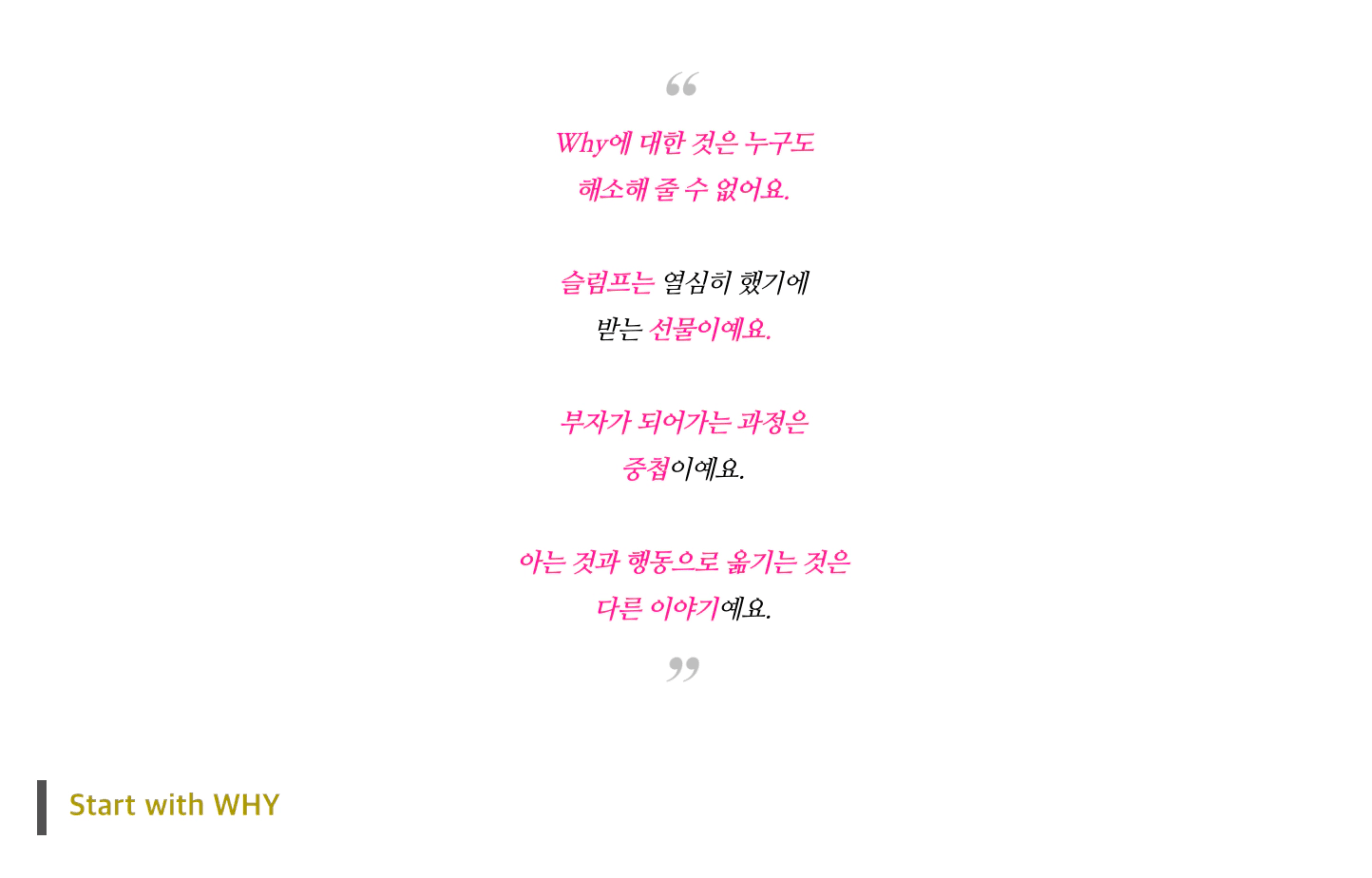 저는 굉장히 느린 사람이였기에 아직도 이유를 찾아가고 있고 각각의 행동에 제약이 따를 때도 있습니다. 하지만 이전과는 달리 지금은 그것이 스트레스라기 보다는 조금 더 편안한 마음을 가질 수 있게 되었고 유연한 자세로 받아들이고 흡수하려고 노력하고 있습니다. 투자 인생에서 저의 2번째 자아는 이제 조금씩 이러한 것에 익숙해지고 물들어 가고 있어 왜 이곳에 와 있는지에 대한 고민까지 오게 되었다고 생각합니다. 기술적인 이유를 찾는데 처음 3년을 썼다면 앞으로 3년은 저의 정체성과 투자를 하는 이유에 대해 깊이 고민하지 않을까 생각합니다. 정답은 없고 저에게 맞는 답을 찾아가는 과정이 투자 인생이라는 생각을 합니다. 답이 없기에 막연할 수 있다고 생각하지만 다시 생각하면 그렇기 때문에 더 자유롭게 행동하고 생각하고 고민할 수 있다고 생각합니다. 제약없이 저를 가두는 것 없이. 할 수 있는 모든것을 해보고 더 많이 고민해보려 합니다. 나만의 WHY를 찾기 위해.