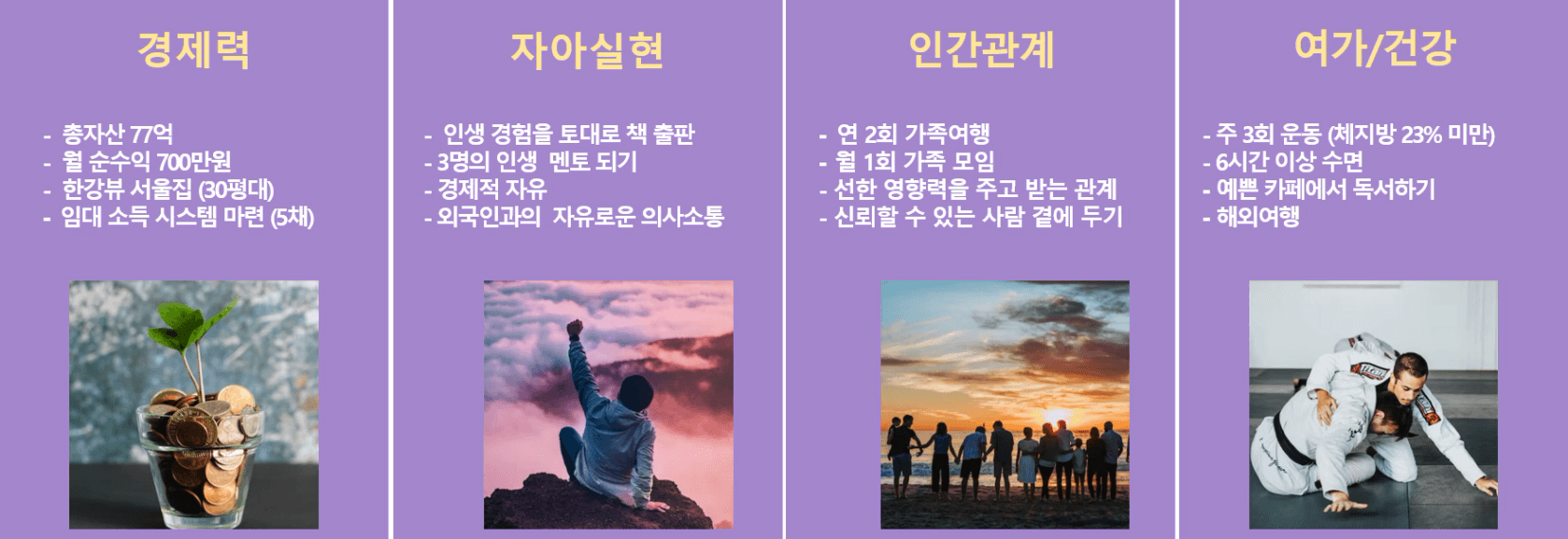 - 인간관계: 월 1회 외식, 매일 강아지 산책, 동료/친구 안부묻기