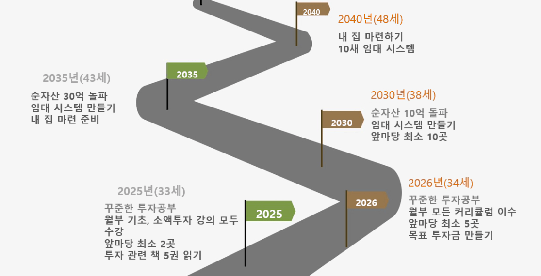 비전보드 실현을 위해 5년 단위로 20년 계획을 세워봅시다. (2025/ 2030/ 2035/ 2040/ 2045년)