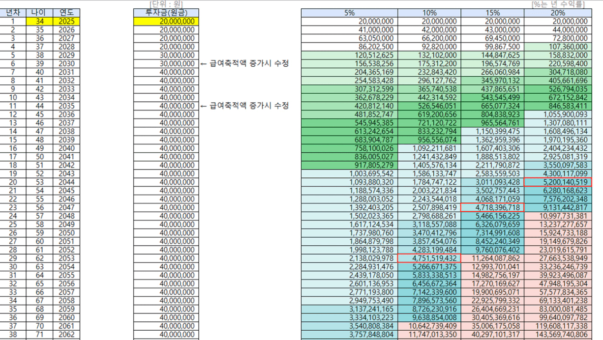 - 수익률 20%: 53세 (2044년)