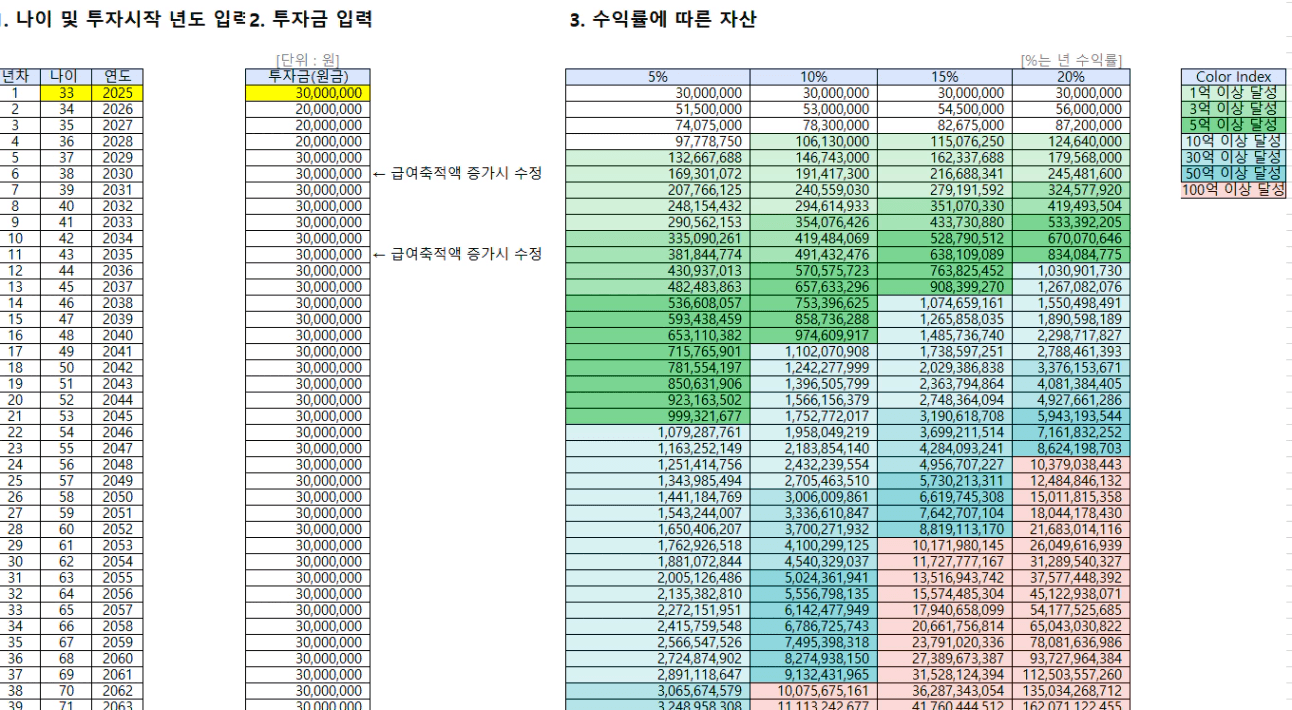 - 수익률 10%: 59세 (2051년)