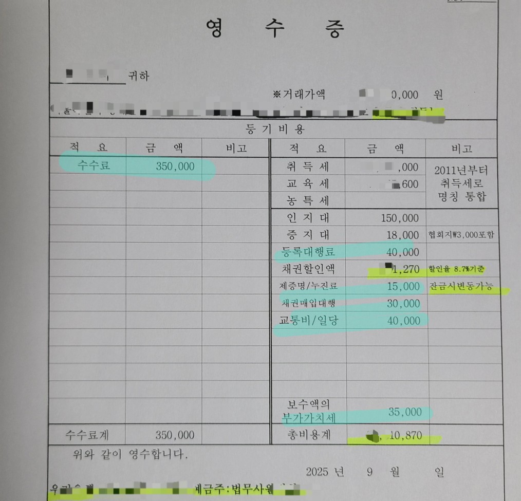 안녕하세요 미미미맘님 일단 너무너무 축하드립니다. 일단 표시해준 등록대행료, 부가가치세, 제증명/누진료, 채권매입대행, 교통비일당들은 일단 조정이 가능한 것들이고 험블님 말씀처럼 법무통이나 지인들에게 소개를 받아서 견적을 받아보시고 비교해서 협상해보시면 좋을 것 같습니다. 일단 금액 자체는 비싼편은 아니니 잘 비교해보시면 좋을 것 같습니다!