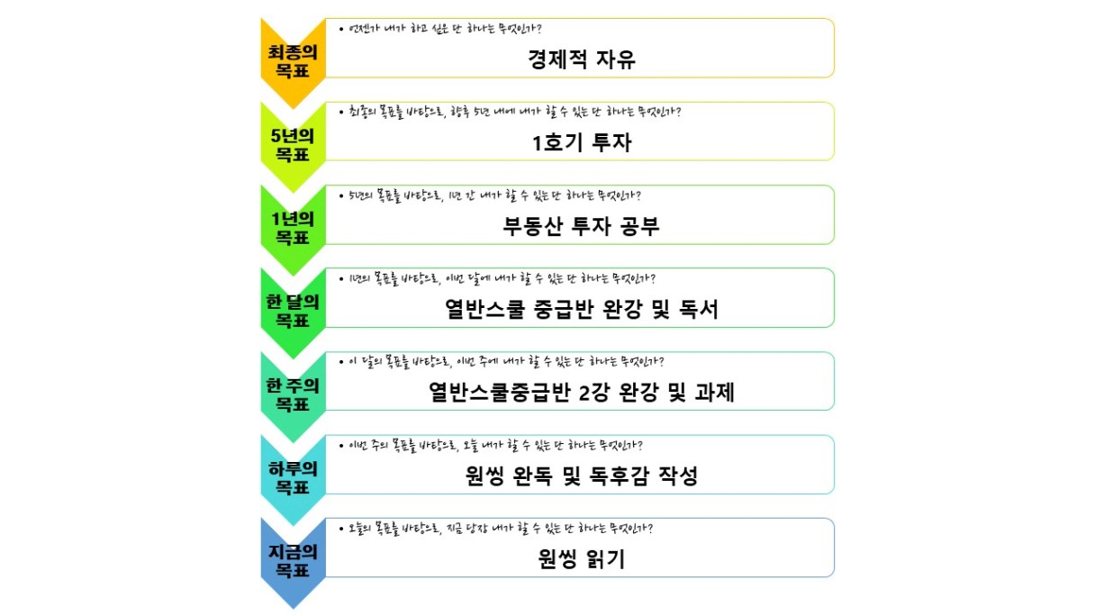 『몰입』에서 말한 것처럼, 후회 없는 삶을 위해서는 어떤 것에 깊이 몰입해야 한다. 『원씽』 역시 같은 메시지를 던진다. 내가 “부동산은 나랑 상관없어”라며 미뤘다면, 10년 뒤 분명히 후회했을 것이다. 지금 내가 공부하는 이유도 “그때 했더라면…” 하는 후회를 반복하지 않기 위함이다.