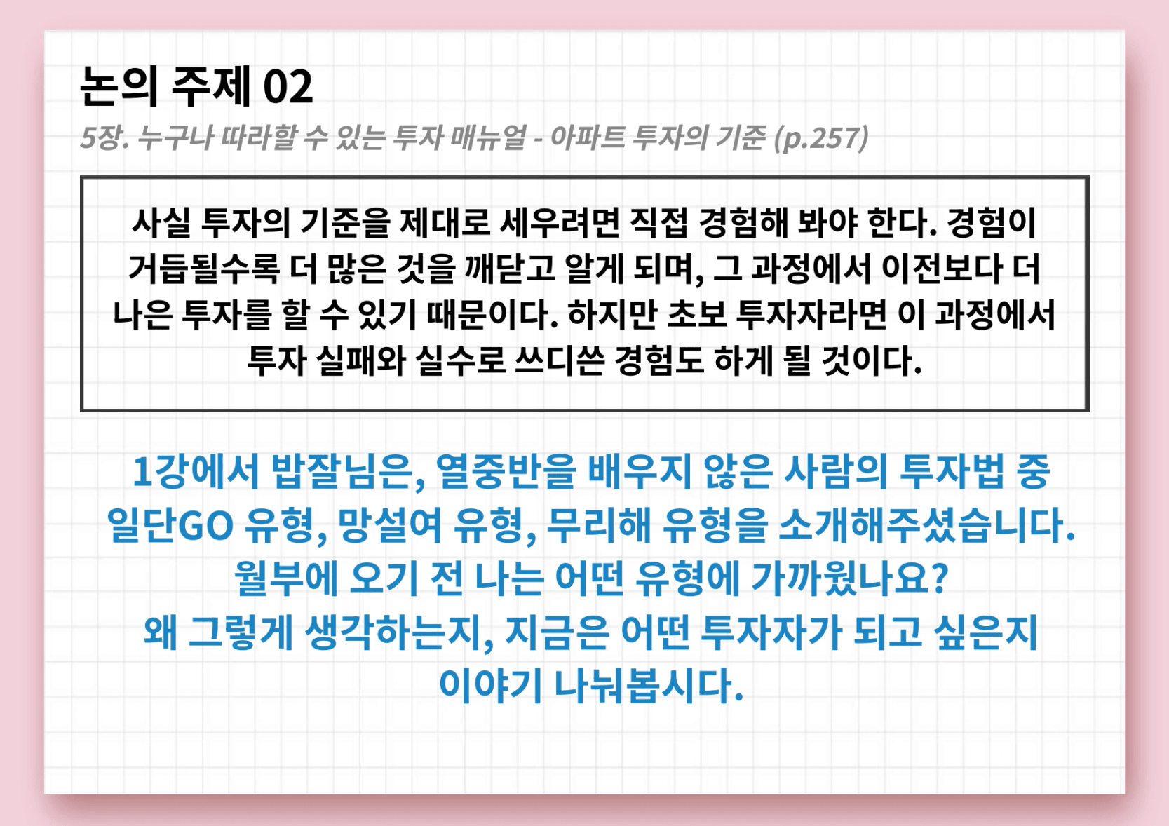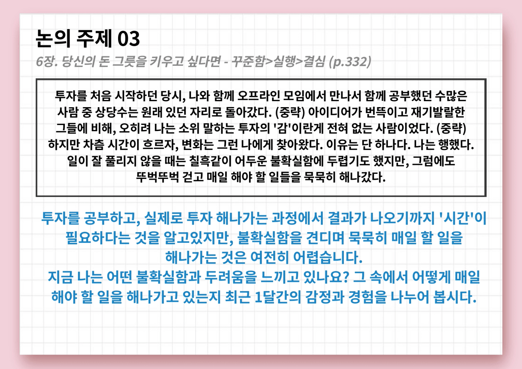 1. 이번에 열중 과제로 이 책을 다시 읽으면서 독서 외의 것들은 느긋한 마음으로 접근하라는 말씀이 가장 와 닿았습니다. 조급함으로 독서 외의 것들을 하며 보냈던 시간들을 돌아보게 되었습니다. 실수도 있었지만, 경험을 통해 배운 점들을 잘 복기하고 처음으로 돌아가 투자 공부의 순서대로 실행해 보겠습니다.