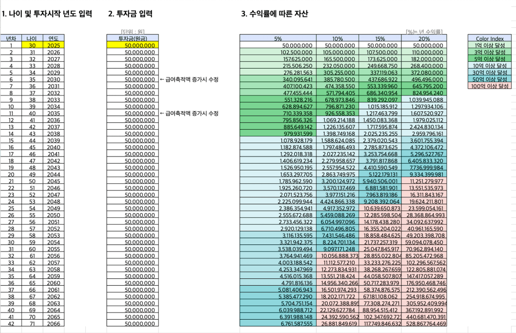 목표 금액 48억 (현재 나이 30세, 연저축액 5000만원에서 시작)