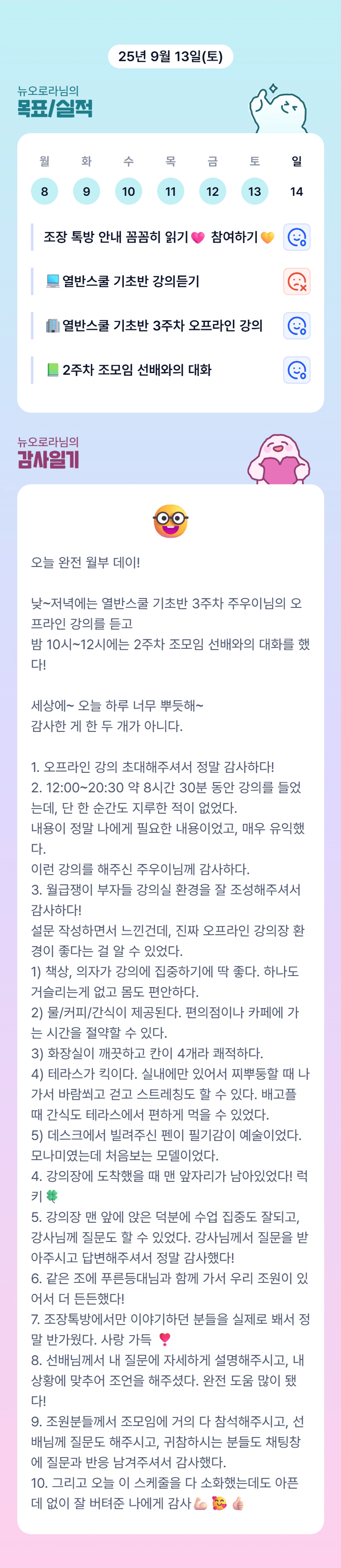 로라님 오늘 완전 알찬 하루였네용ㅎㅎㅎ 실강에서 만나 반가웠습니다! 마치고도 조모임까지!! 고생 많으셨어요 😊😊