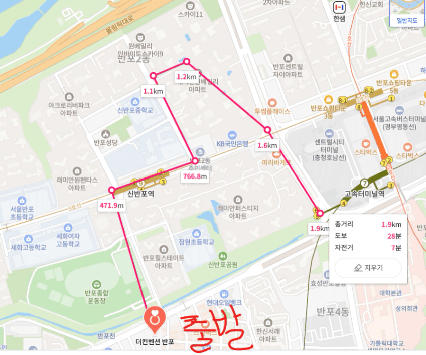 신반포역까진 걸어서 10분, 원베일리까진 15분 정도 걸린 것 같아요.