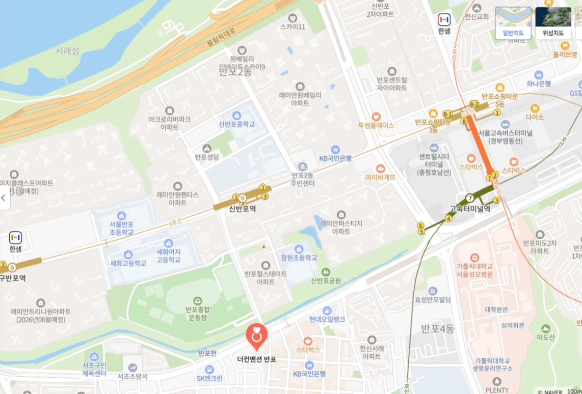 고속터미널·원베일리 맞은편의 구축 아파트들이 보이고,