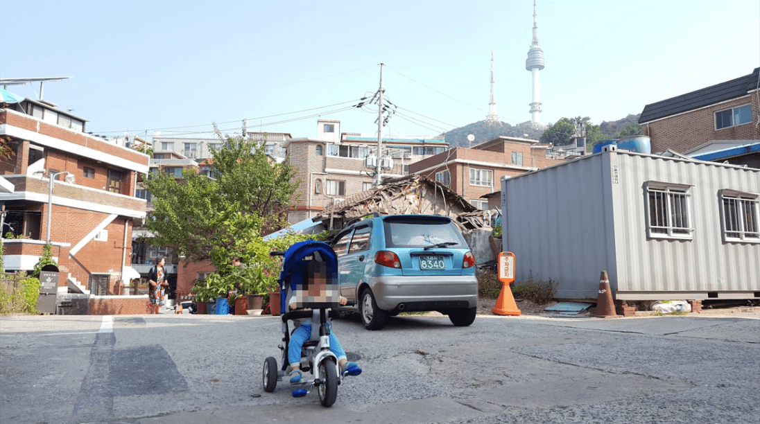 유모차를 겨우 끌고 비탈길을 내려가면 만나는 차도와 매연…