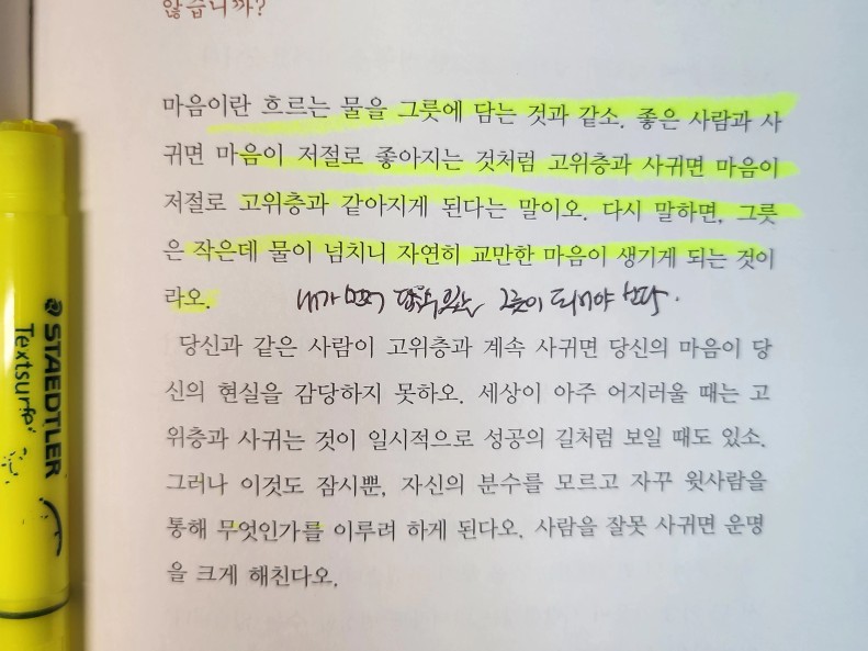 - p42~43. 지성으로 동료를 위하고 아랫사람을 사랑으로 보살피는 것에 온 힘을 기울이시오. 절대 아랫사람에게 교만해서는 안되오. 이와 같이 지금까지와 다른 삶을 살면 당신은 운명대로 크게 성공할 것이오. 마음이란 흐르는 물을 그릇에 담는것과 같소. 좋은 사람과 사귀면 마음이 저절로 좋아지는것처럼 고위층과 사귀면 마음이 저절로 고위층과 같아지게 된다는 말이오. 다시말하면 그릇이 작은데 물이 넘치니 자연히 교만한 마음이 생기게 되는 것이라오.