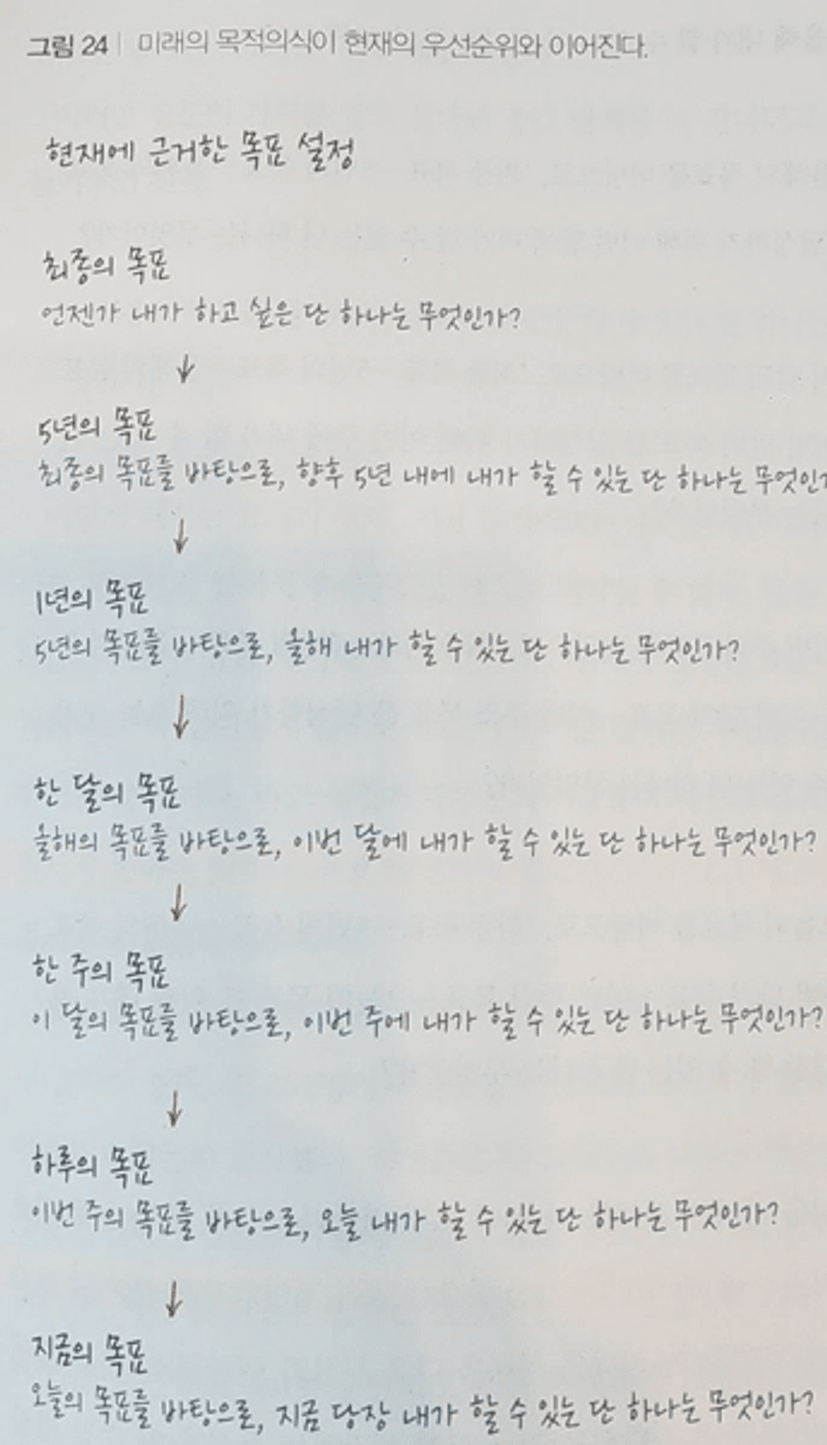 >>>당장 급하다고 현재 당면한 문제를 원씽으로 삼아서는 안된다. 지금의 목표는 신중히 나의 삶의 목적을 고민한 후결정해야 하단. 먼저 어떤 숲을 만들지 고민하고, 그 안에 원하는 나무들을 심기 위해 선택된 씨를 뿌리는 행동을 해야 것이다(비전보드부터 작성하자).