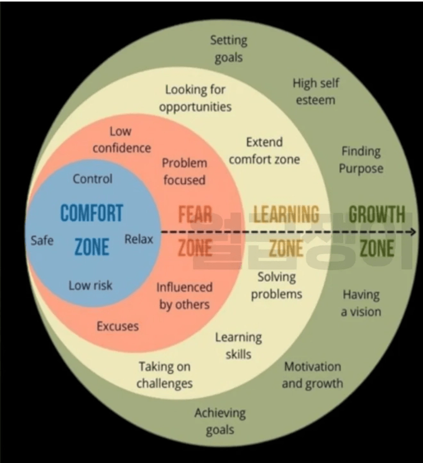 사람들은 대부분 comfort zone에 있으나, 빠르게 성장하고 싶다면 growth zone으로 가야함