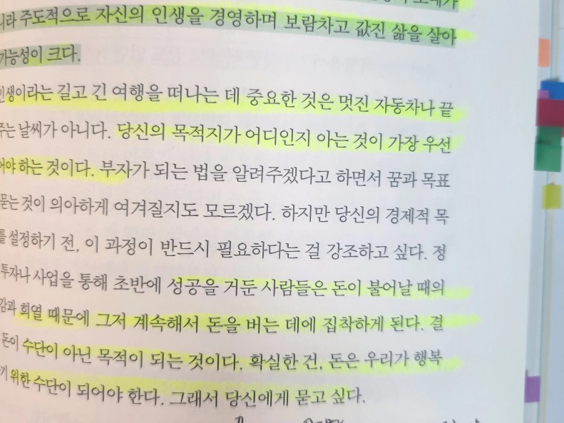 : 돈을 다룰수 있는 능력이 없는 사람에게 하루 아침에 찾아온 엄청난 부는 허무하게 빠져나가게 마련이다. 명확한 목표를 가지고 살아 가는 사람은 일상의 노예가 아니라 주도적으로 자신의 인생을 경영하며 보람차고 값진 삶을 살아갈 가능성이 크다. 인생이라는 길고 긴 여행을 떠나는데 중요한것은 멋진 자동차나 끝내주는 날씨가 아니다. 당신의 목적지가 어디인지 아는것이 가장 우선되어야 하는 것이다. 당신의 인생목표는 무엇인가? 그 목표를 종이에 적어 두었는가? 하버드 경영대학원 학생들의 인생을 추적한 결과, 인생의 목표를 종이에 기록한 사람과 그렇게 하지 않은 사람들의 삶의 모습은 극명한 차이를 보였다. 자기 인생의 목표를 구체적으로 세우고 이를 종이에 적어둔 경영대학원 학생 대부분은 나중에 엄청난 부자가 되었다. 투자와 투기를 구분하라. 투자와 투기는 어떻게 다른 걸까? 투자는 특정한 이득을 얻기 위해 시간과 자본을 들이는 행위를 말하는데, 이를 통해 자본이 형성된다. 반면 투기는 상품이나 유가증권의 가격변동의 차이를 이용해 이익을 보려고 하는 행위를 말한다. 기대수익이 합리적 기준에 다라 선정된것이 아니라, 감정적 요인과 당시 시장의 모멘텀에 따라 결정되는 경우가 많다. 사람들이 가장 많이 저지르는 실수가, 조급하게 투자 대상을 선정하는 것이다. 스스로 투자에 대한 확신이 서질 않고 자신이 없다면, 좀더 기다리라. 기다리는 것 또한 기회를 갖는 것이다.