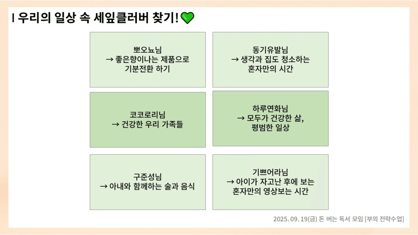 서로 다른 행복 포인트를 듣는 재미도 있었습니다.