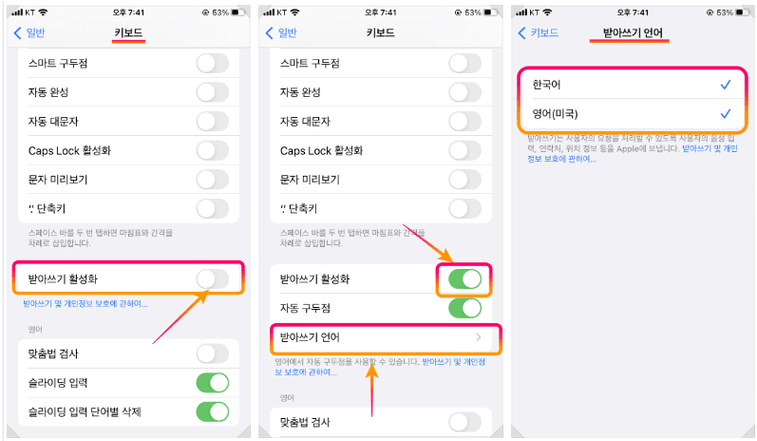 2. 이후에 스크롤을 아래로 내려서 아이폰 받아쓰기 활성화 메뉴가 있습니다.