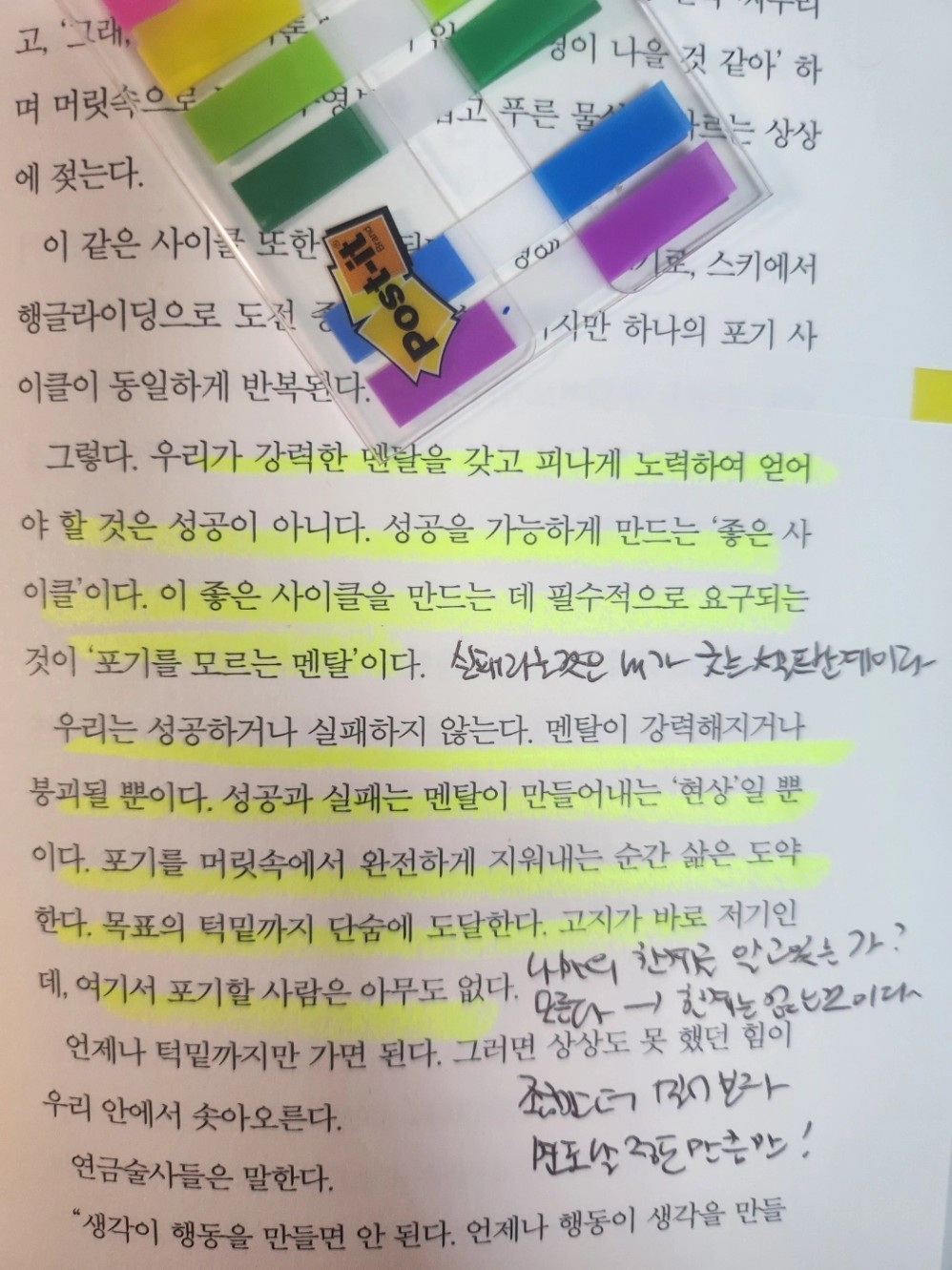 : 나는 지금 당신이 어떤 상황에 처해 있는지 알지 못한다. 어쩌면 당신은 포기하기 직전에 마지막으로 이 책을 짚어들었을수도 있다. 진심을 다해 당부한다. ‘버텨라.’ 포기하고 무대 뒤로 사라지면 다시는 무대에 설 기회를 얻을수 없다. 이기려고 애쓰지 마라. 버티는 데 집중하라. 버티면 힘이 붙는다. 힘이 붙으면 이긴다.포기를 고민하고 있다는 것은 이미 포기를 했다는 뜻이다. 앞에서도 말했듯이 ‘포기’ 라는 단어를 우리 삶에서 완전히 추방하는것은 불가능하다 인강느 끊임없이 선택과 포기의 기로에 놓이기 때문이다, 단 포기와 관련해 우리 삶에서 완전히 없앨수 있는 것이 있다. 바로 ‘변명’이다. 지금 숨이 턱턱 막히고 힘겹다는 것은 제대로 하고 있다는 뜻이다. 올바른 길을 가고 있다는 의미이다. 변명이 아니라 확신을 찾아라. 정상에 선 사람들은 모두 확신에 찬 얼굴을 하고 있다. 성공하고 싶다면 반드시 대가를 지불해야 한다. 인내심이든 도전 정신이든 용기든 노력이든, 반드시 대가를 지불해야만 목표를 달성하고 성공을 얻을수 있다. 이 평범하지만 값진 진리를 생생하게 깨닫고 난후 나는 백만장자가 될수 있었다. 나 자신을 이끄는 리더가 되지 못하면 타인, 행운, 기회, 성공은 언제든 당신을 떠날 만반의 채비를 갖추고 있다는 사실을 평생 잊지 마라. 과제를 해결할 때마다 우리는 그만큼 강해진다. 그만큼 성장한다. 뿌리를 단단히 박고 하늘을 찌를 듯이 서 있는 나무들을 보라. 그들은 폭풍우를 견딘 모습이다. 우리가 강력한 멘탈을 갖고 피나게 노력하여 얻어야 할 것은 성공이 아니다. 성공을 가능하게 만드는 ‘좋은 사이클’이다. 이 좋은 사이클을 만드는데 필수적으로 요구되는 것이 ‘포기를 모르는 멘탈’이다. 우리는 성공하거나 실패하지 않는다. 멘탈이 강력해지거나 붕괴될 뿐이다. 인간은 모두 무언가 되고 싶어한다. 하지만 그 누구도 무언가가 되려고 노력하지 않는다. 성정과 성공을 원하는 사람은 예외없이 1학년 교실에 들어가 기초를 탄탄하게 배워나가야 한다. 먼저 1만달러를 저축하고 투자하는 법을 배운 후에야 10만달러를 모으고 투자하는 법을 터득할 수 있다. 더 나은 상황은 주어지지 않는다. 그러니 기다려서는 안된다. 바로 지금의 상황이 우리에게 주어진 최선의 상황임을 명확히 인식하면 포기의 유혹에서 벗어날 힘을 얻는다.