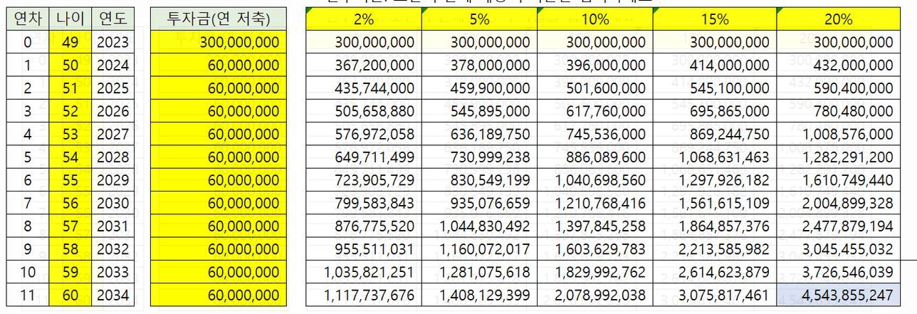 총자산5억 첫투자금3억, 연저축액(투자금)6000만원, 11년 수익률20%일때 45억 달성(61세 은퇴예정)