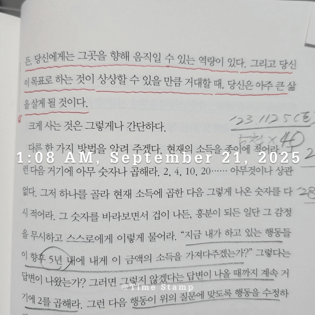 : 한 번에 하나씩!! 이번 재독을 통해 얻은 단 하나의 문장이다. 그리고 큰 삶을 상상해보고 그 삶을 나도 만들어낼 수 있다는 자기신뢰를 느끼면서 눈물날 정도로 벅차올랐다. 앞으로의 큰 삶을 위해, 내가 생각한 노후대비를 위해 목표를 이룰 때까지 해낼 수 있을 것 같다.