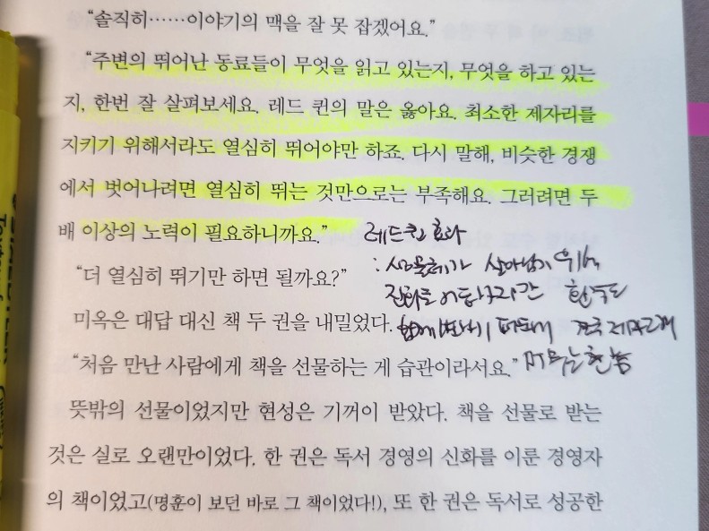 : 레드퀸 효과는 주로 생물학에서 많이 쓰이는 말이에요. 생물체가 살아남기 위해 진화를 거듭하지만 환경도 함께 변하기 때문에 결국은 제자리에 머무는 것과 같은 현상이죠. 주변의 뛰어난 동료들이 무엇을 읽고 있는지, 무엇을 하고 있는지, 한번 살펴보세요. 레드퀸의 말은 옳아요. 최소한 제자리를 지키기 위해서라도 열심히 뛰어여만 하죠. 다시 말해 비슷한 경쟁에서 벗어나려면 열심히 뛰는 것만으로는 부족해요. 그러려면 두배 이상의 노력이 필요하니까요. 한 권의 책은 하나의 세상이었다. 도사관의 책들은 아직도 모르는 세상이 이렇게나 많다고 조용히 외치고 있었다.