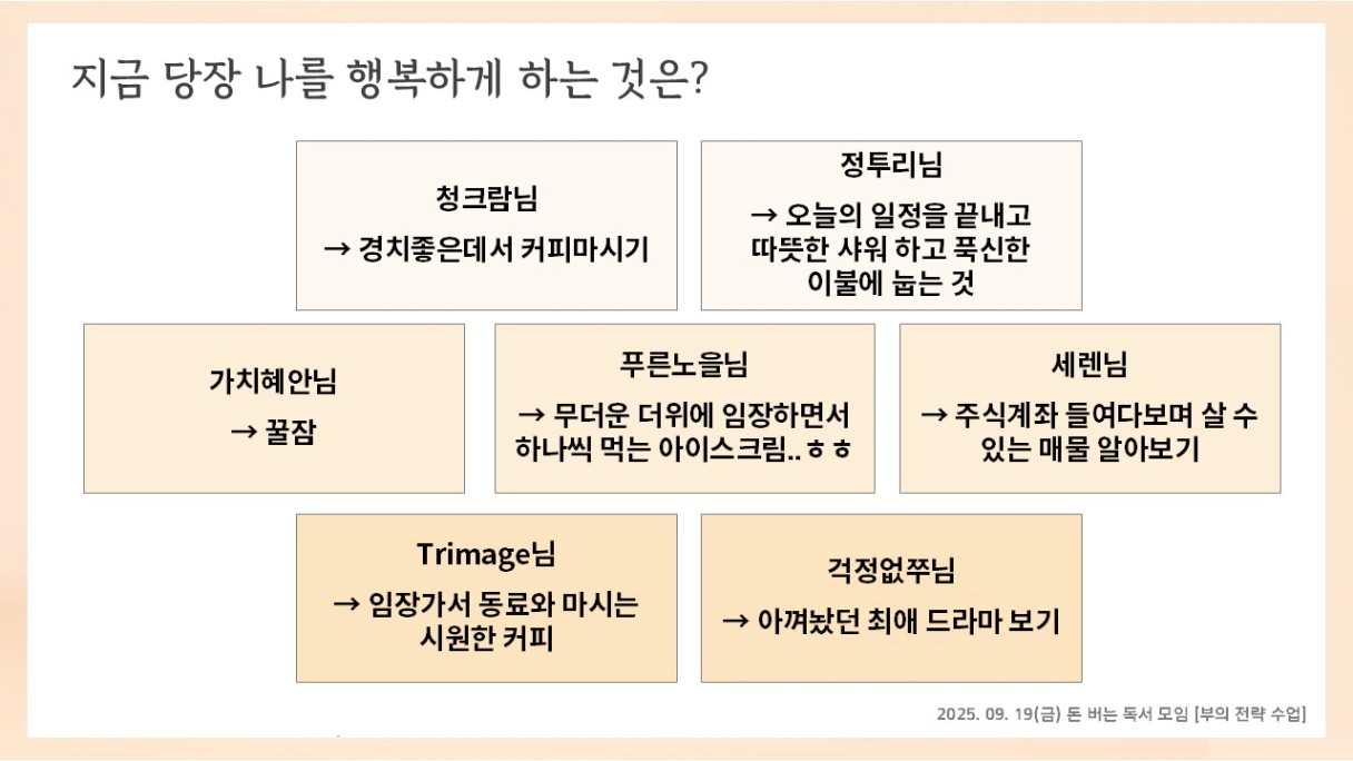: 서로의 행복한 순간과 행복 버튼을 이야기 나누는 시간이었습니다.