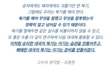 복기를 하면 좋다는 말씀을 선배님, 동기분들에게 들었음에도 이제야 첫 복기를 해보는 점