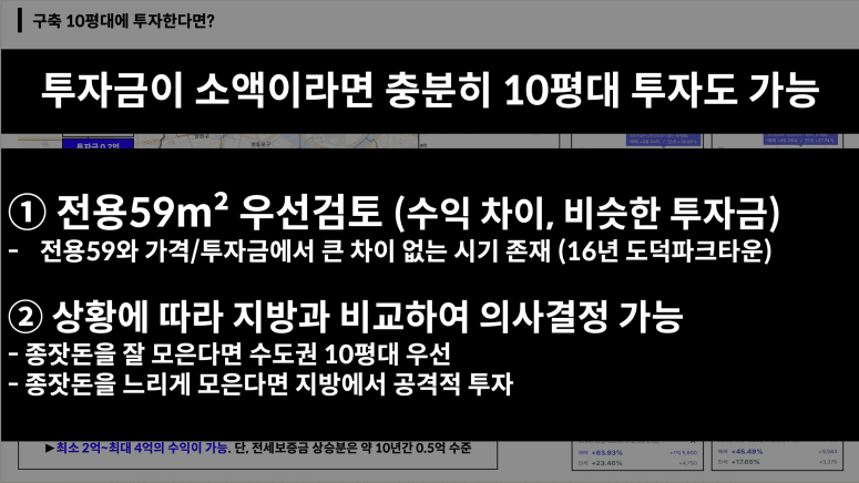 직접 비교해보기 전에는 막연히 10평대, 20평대, 30평대 등 평형에 관한 프레임으로만 바라봤다면, 과거 10평대 물건에 투자했을 때 벌어진 일들에 대해 돌아보고, 앞으로 어떤 일들이 벌어질 수 있을지 스스로 고민하고 판단해보니 평형에 관한 프레임을 넘어 ‘입지와 가격, 그리고 수요와 선호도’라는 본질에 더 가까워질 수 있었습니다.