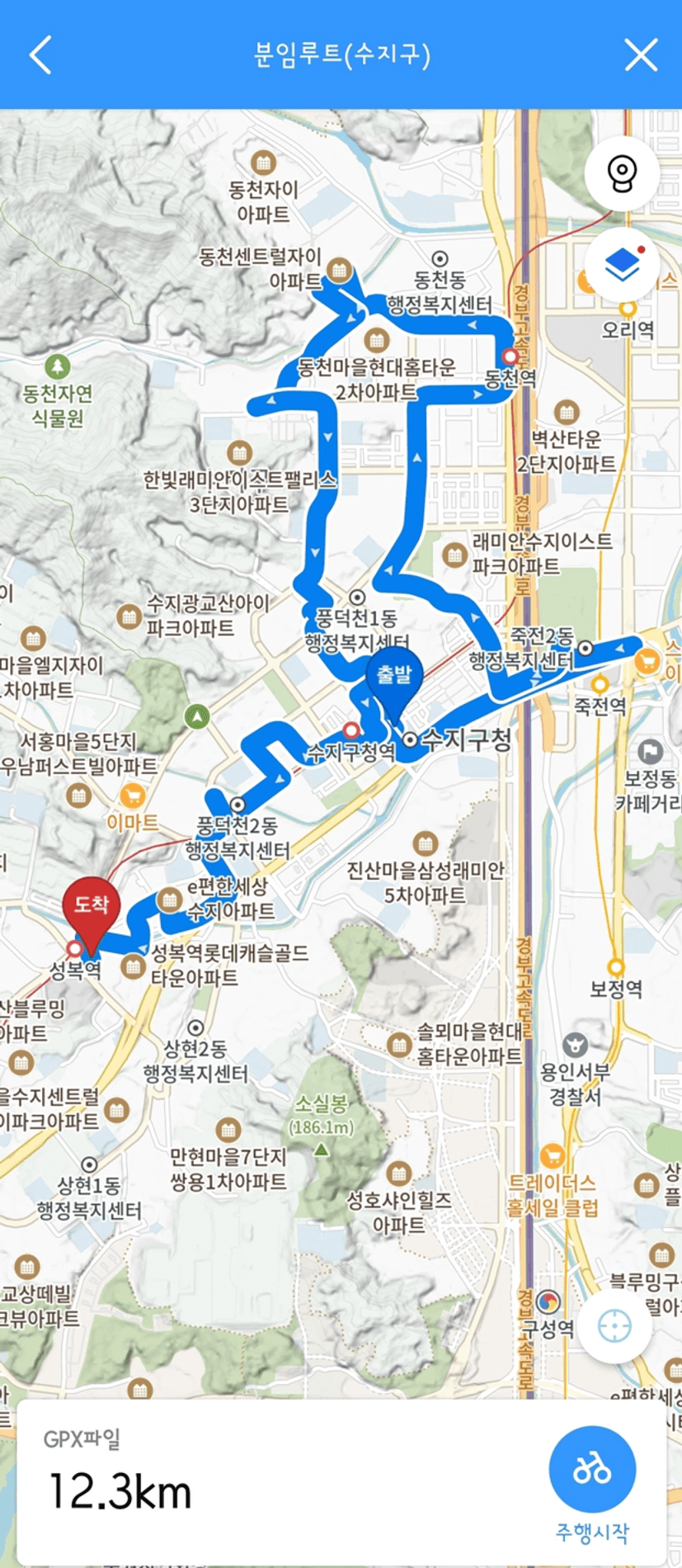 분임루트는 약 12km 정도로 수지구청→죽전→동천→수지구청→성복 순으로 임장했습니다.