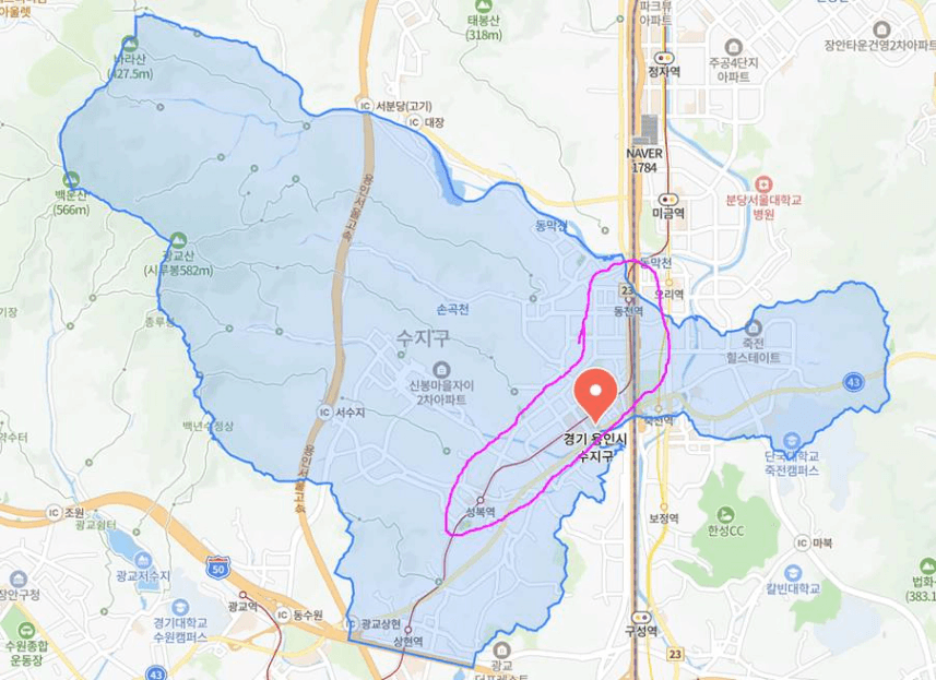 기존에 제가 알고 있던 수지(아래 자주색 부분)외에 더 많은 지역이 있단 걸 알게 되었고,