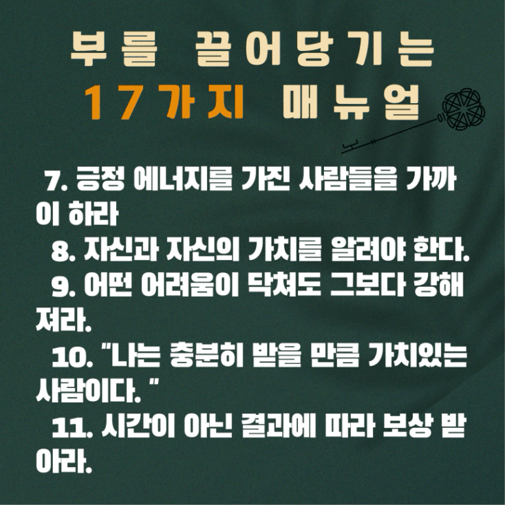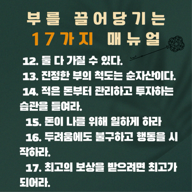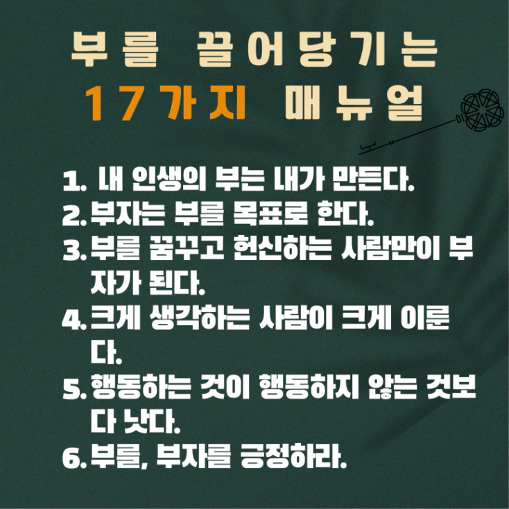 : 이 책은 17가지 부를 끌어당시는 백만장자의 마인드에 대해 챕터별로 알려준다.
