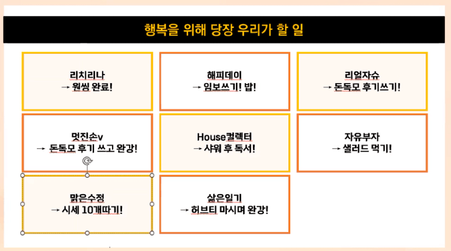 비록 행복을 위해 당장 우리가 할 일을 정하고 실천을 하지는 못했지만