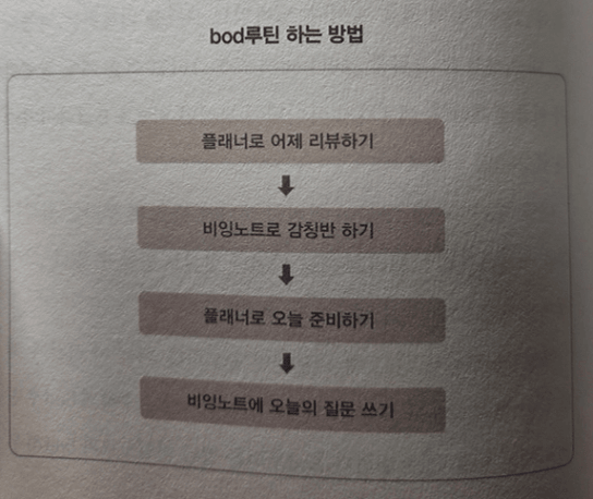 p204 bod플래너는 일을 잘하기 위해 , 생산성을 높이기 위해 쓰는 것이 아니다. 일뿐 아니라 삶 전체를 내가 원하는 모습으로 만들기 위해 쓰는 것이다. bod하우스의 루틴들을 오늘 내 하루에 충실히 반영하기 위해서 쓴다. 딥마인드가 만든 인생의 큰 그림이 오늘 24시간 안에 디테일하게 구현될 때 비로소 오거나이징이 완성된다.