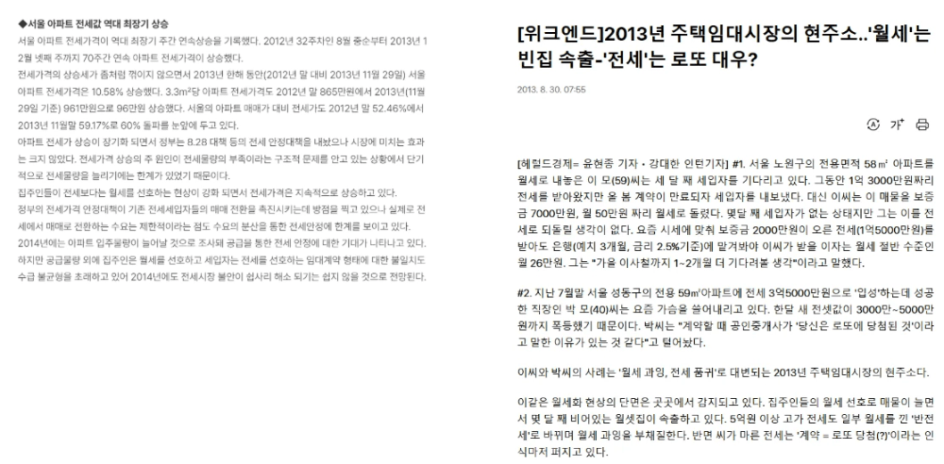→ 2013년에 왜 전세가 월세로 전환됐지? 당시 뉴스에 따르면 가계부채와 저성장 기조가 계속되서 전국아파트 전세가격이 70주연속 상승했다고 함.씨가 마른 전세계약은 로또당첨수준이라는 소리까지! 하락장을 겪으면서 매수수요 < 전세수요. 집주인의 경우 전세금으로 은행에 이자를 받는 경우 금리도 낮고 주담대도 70%까지 완화해줘서 대출 더 받아도 월세받는게 낫겠는데? 그냥 현금흐름 만들자! 따라서 2013년에 전세로 살고자 하는 사람들은 많지만 전세는 점점 없어서 전세값은 상승되었다고 한다. 나였으면 아마 다주택자에 대한 규제가 없었다면 한채 더 샀을텐데. 월세로 전환되는구나..  공급은 없고 전세의 소멸 & 전세의 월세화? 어디서 많이 들어본 소리인데 2025년 지금!!!