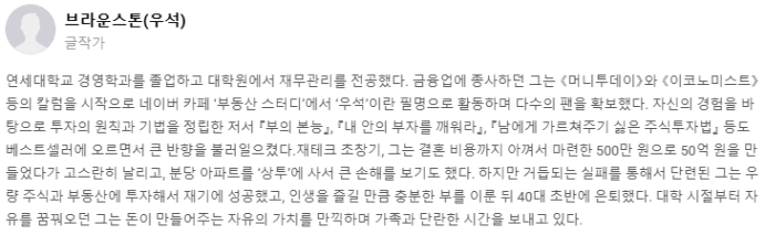 500만 원으로 50억 원을 만든 실전 투자가 브라운스톤(우석)이 필터링한 인문학은 투자 안내서 『부의 인문학』. 노벨 경제학상을 수상한 천재들이 세상을 읽는 탁월한 통찰력, 돈이 움직이는 방향과 투자의 길, 부의 작동원리를 간파한 통섭의 결정판이다. 저자는 이 책에서 자기 안에서 소화된 인문학과 지금의 우리 현실을 씨실과 날실로 엮어가며 투자에 대한 거대한 태피스트리를 엮어간다.