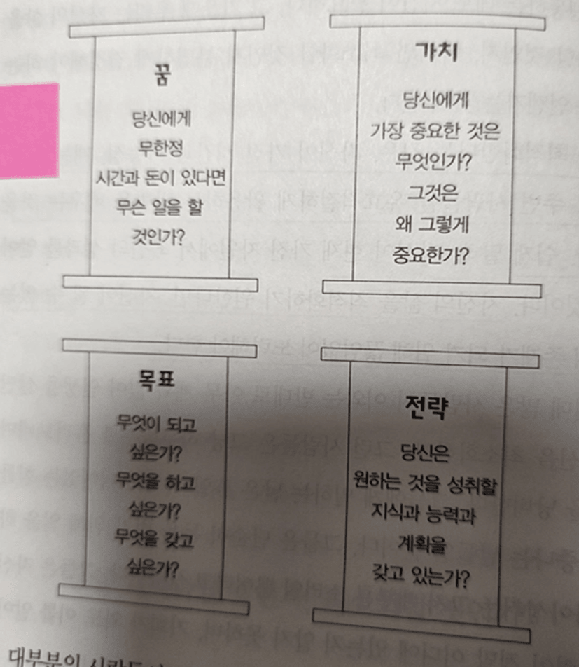 p43 많은 사람들이 계획을 실천에 옮기지 못하는 이유는 꿈과 목표와 가치와 전략을 한데 묶지 못했기 때문이다.