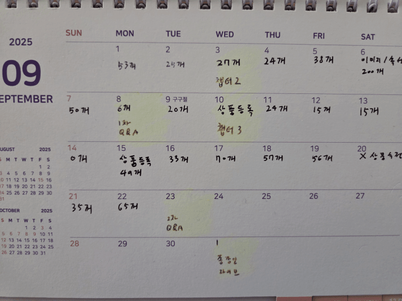 상품 가공을 시작하며, 매일 작성했던 가공캘린더 입니다.