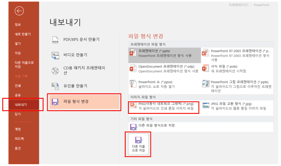 [파일] - [내보내기] - [파일 형식 변경] - [PNG] - [다른 이름으로 저장] 하시면