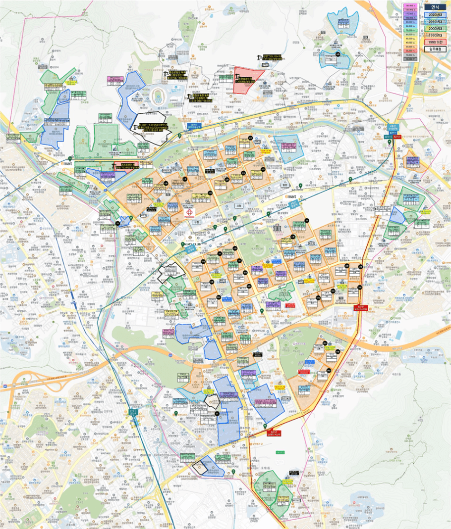 생활권별 아파트 연식을 한눈에 보거나(단지 색을 연식에 따라 설정하는 경우),